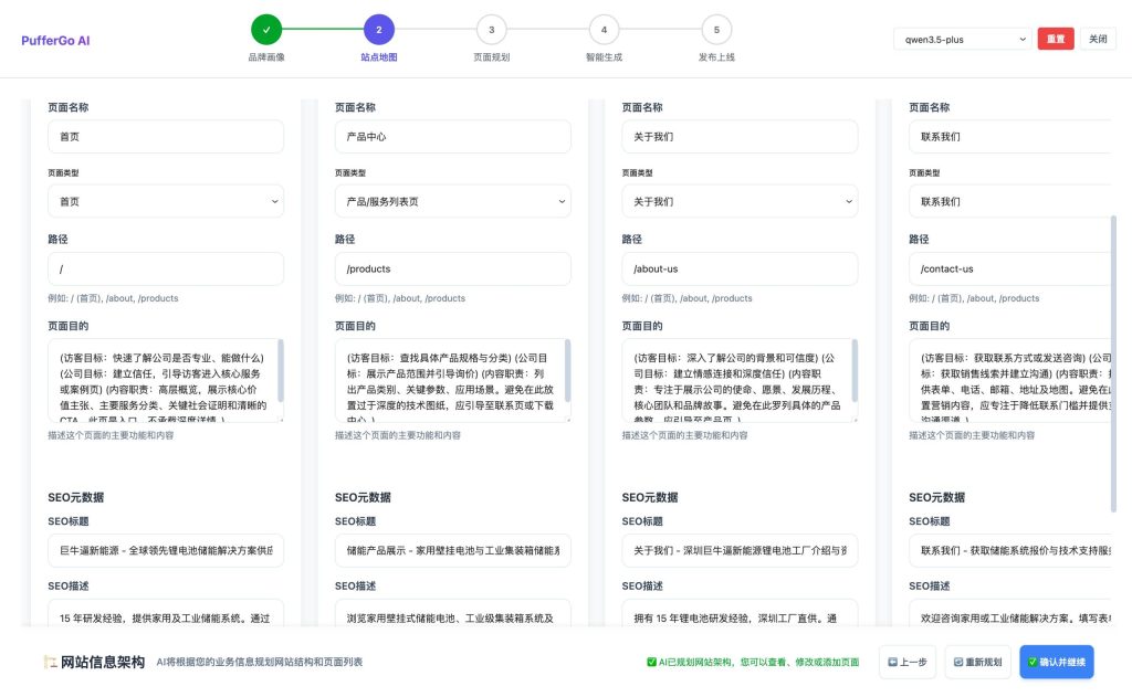 - 标准页面结构:自动规划符合外贸独立站规范的页面路径(slug)(如